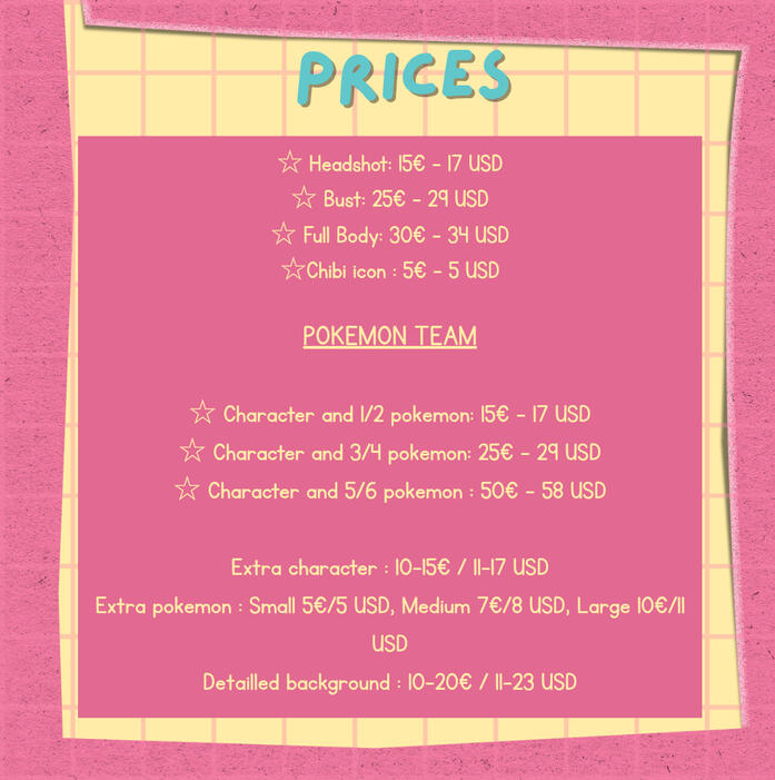 - Deadline: usually I take 4 days when not busy, but it can go up to 2 weeks during school time. You will be informed when commissioning me of when you will receive your commission. Please keep in mind that I have a life